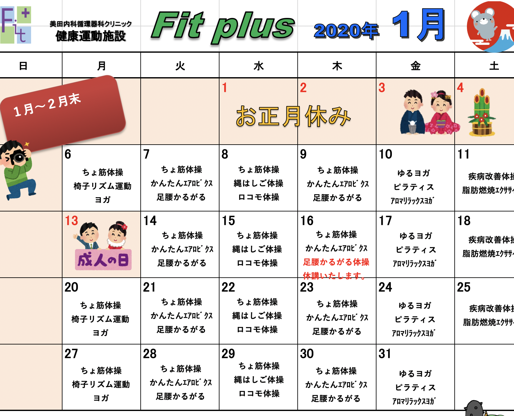 生活習慣病の予防・改善のため、平成17年11月より始まりました当院運動教室。たくさんの方々にご愛顧頂いた運動教室は、健康運動施設FitPlus(フィットプラス)として生まれ変わりました。私たちはこれまで運動療法を通して、検査値の改善や体調の改善などの喜びを感じ、運動が生活になくてはならないものになった患者様を多く見てきました。これからもたくさんの方に運動の素晴らしさを実感してもらい、ご自身の身体と向き合ってほしい、大切にしてほしい。そんな思いからFitPlusは生まれました。FitPlusでは一人ひとりに合った運動プログラムを作成・指導いたします。体操教室も新たにクラスが増え、都合のよい曜日の教室に参加が可能になります。患者様にとってより運動を継続しやすい環境が、FitPlusにはあります。