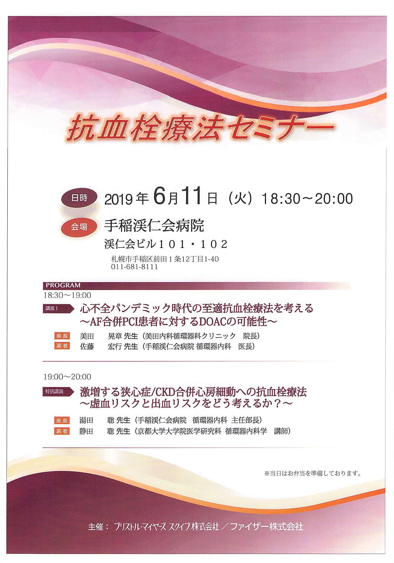 特別講演では札幌医科大学の橋本曉佳准教授より「静脈血栓塞栓症の治療指針」と題して最新の治療法について非常に興味ある内容であった。VTEは最近急速に増加している疾患である。以前はブラックジャックにも出てくる奇病であったが、めざましい診断技術の進歩によって、またエコノミークラス症候群や震災地での発症などで認知度が高まり急増しているとのこと。昨年改定されたVTEの診療ガイドラインの要点など非常に明快に解説された。重症度がそれほど重くなければ、出来るだけ外来治療をそしてヘパリン・ワーファリンよりDOACの使用が、良好な予後・臨床成績であることを示された。リクシアナの低容量15mgの使用経験なども解説された。