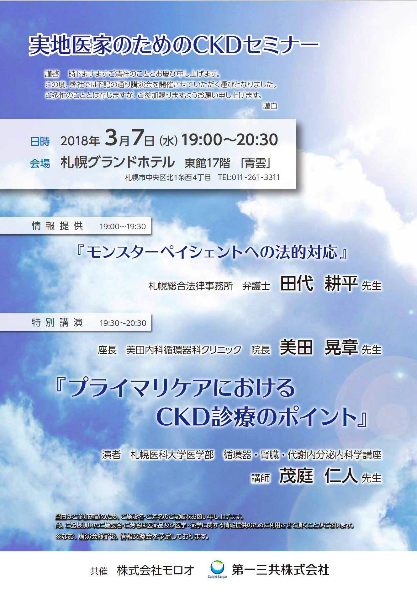 実地医家シリーズ第3弾の企画は「CKDのテーマ」となった。札幌医大の茂庭先生より、わかりやすい腎臓病に対する診断の手順を解説いただいた。超高齢化社会においては腎機能低下患者は、毎日のように対応が迫られるが、プライマリ・ケアにおいてとても役に立つ講演であった。札幌医大も標榜科が変更になり、腎臓病に力点を置いて臨床を再構築している。茂庭先生はその中心となって、その推進を担っている。