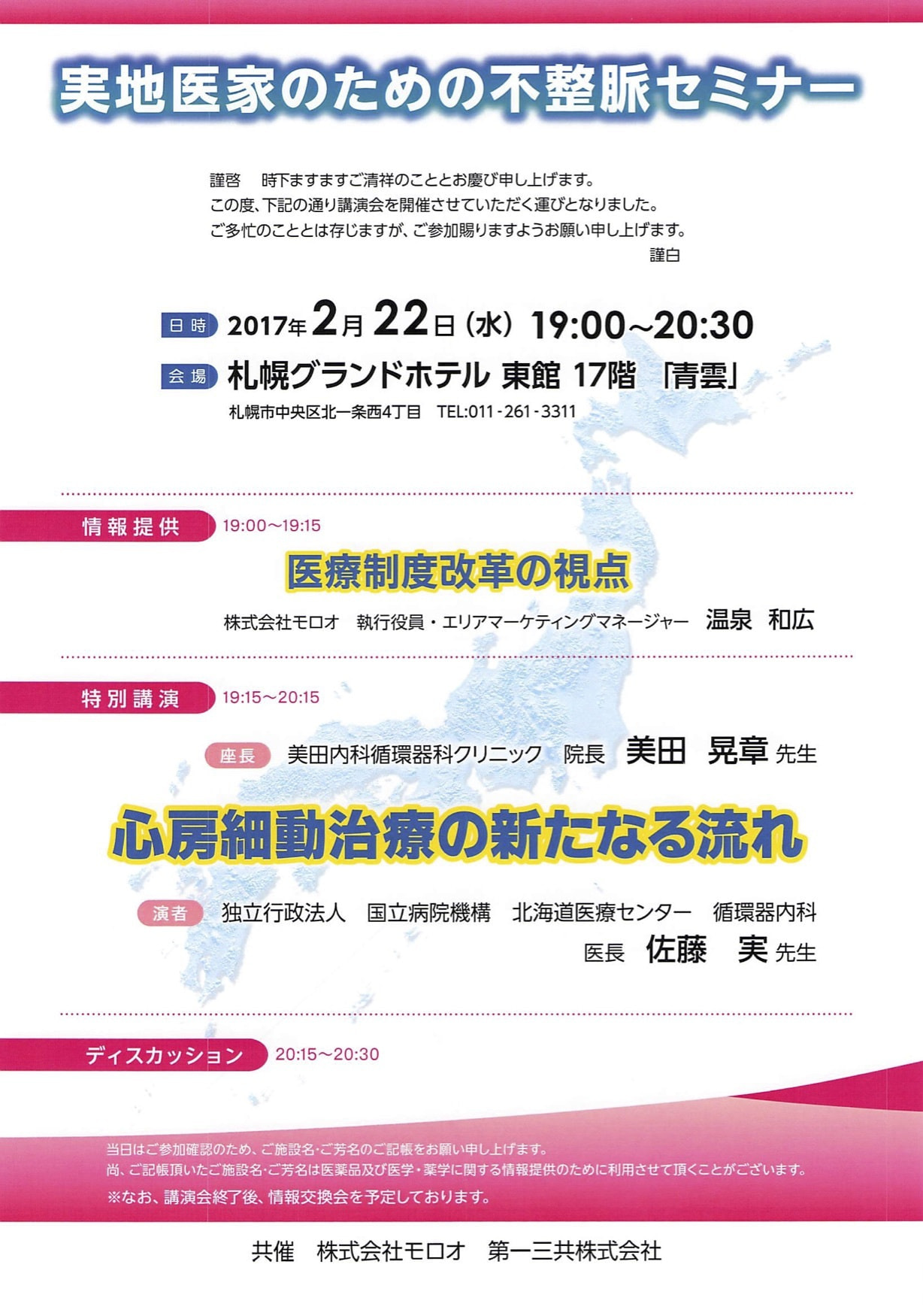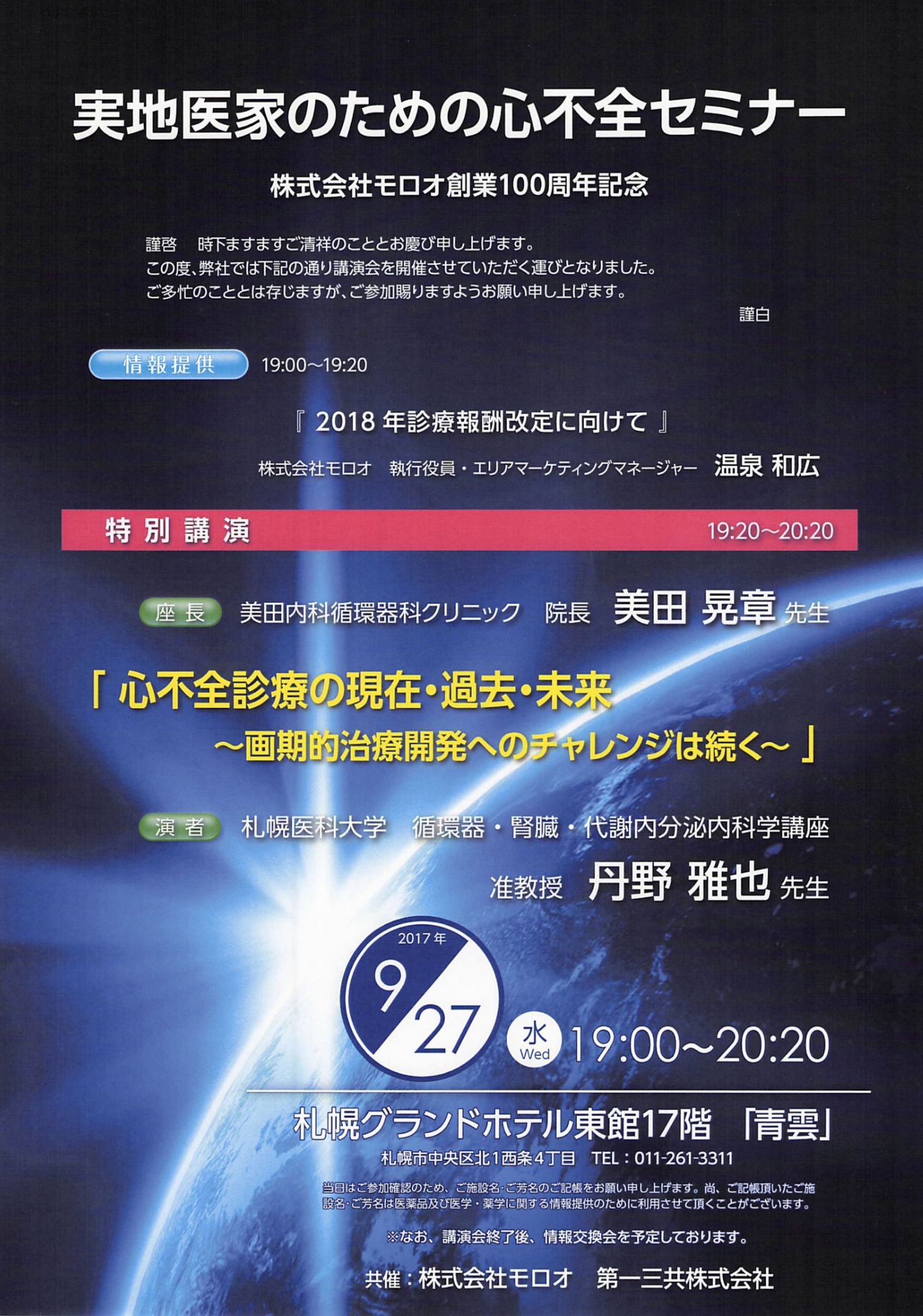 株式会社モロオ創業100周年記念講演として催され、春に行われた不整脈セミナーに続き第2弾の企画となった。今回は心不全をテーマに札幌医大の丹野先生にご講演いただいた。①心不全は超高齢化社会においては今やパンデミックに広がりつつある疾患で、5年生存率は50-60%とがんと匹敵するくらいである。②β遮断剤から始まりRA拮抗剤、イバプラジン、最近のSGLT2阻害剤などにも触れられ今後の可能性を示された。またプレコンディショニング/虚血耐性や虚血再灌流をテーマに札幌医大/英国留学で素晴らしい研究をされてきた先生で、講演では随所に研究の成果も披露された。③最後に心房細動と心不全に関しての最新の知見を示された。全体として非常にわかりやすい内容だった。
