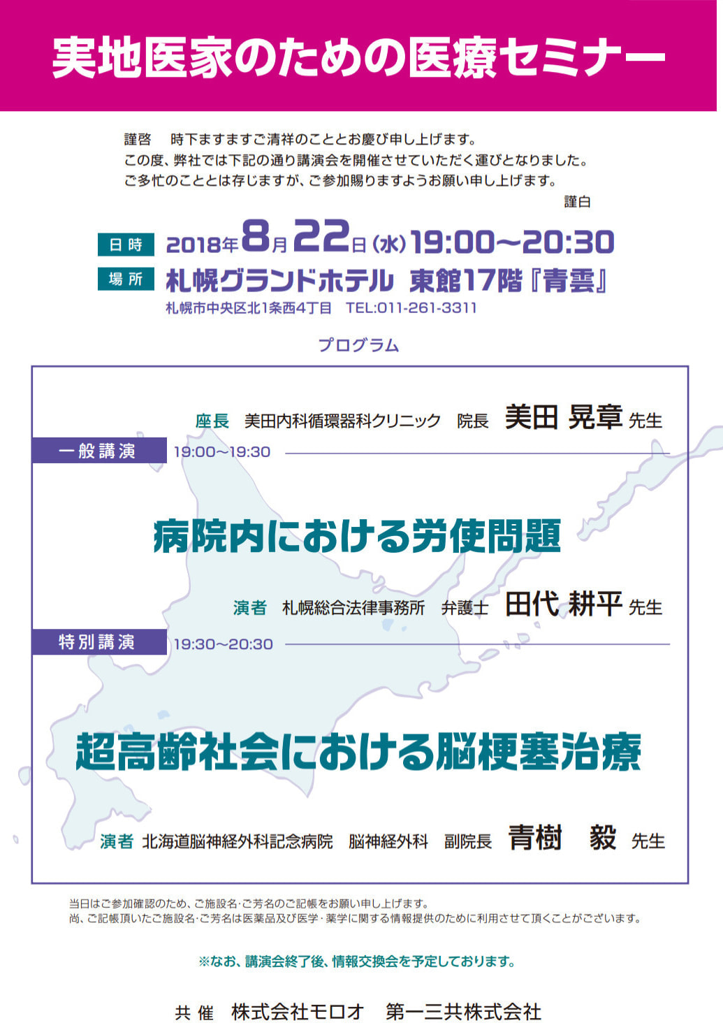 実地医家シリーズ第4弾の企画は田代弁護士を迎えての一般演題と、青樹先生からは特別講演として脳梗塞治療の最近の話題が解説された。