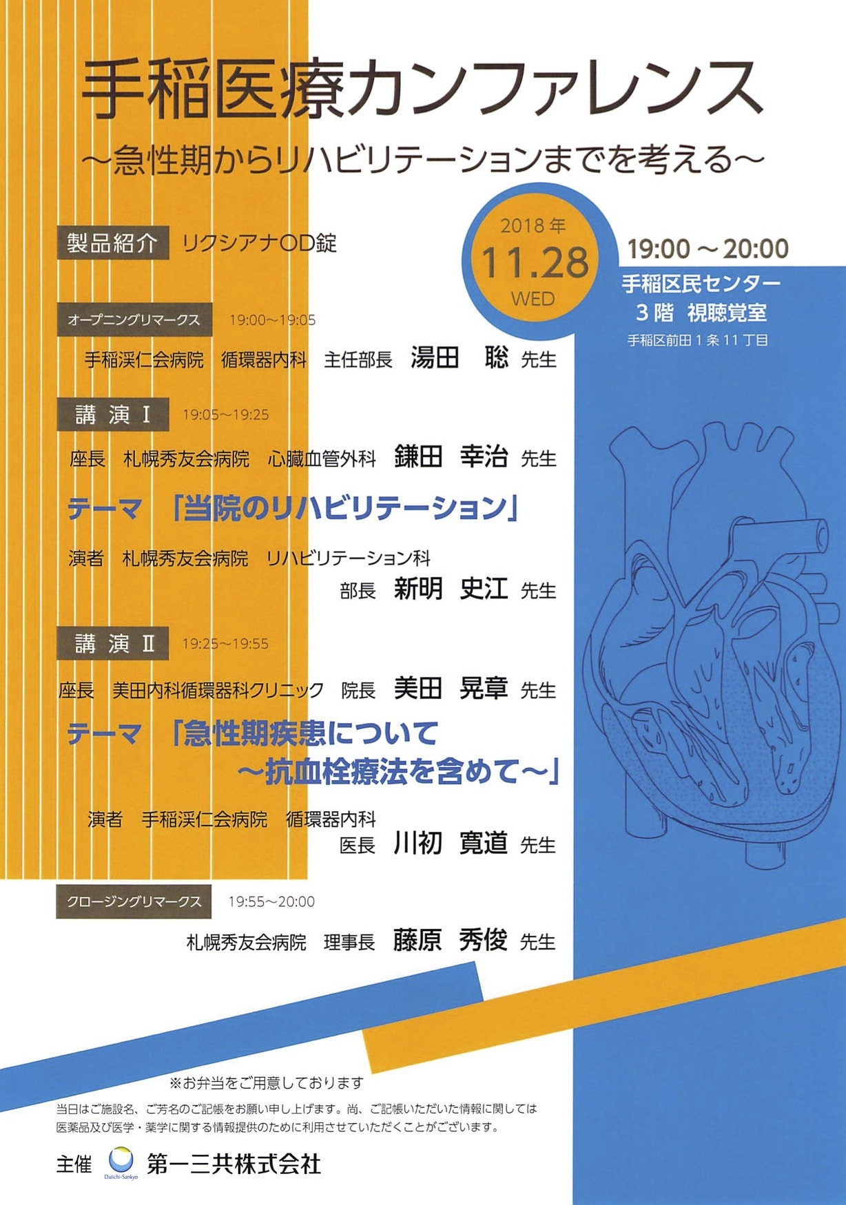 手稲渓仁会病院と札幌秀友会病院の企画で「手稲医療カンファレンス」が開かれた。病診連携を積極的に推進する目的で医療機関の交流を促進しようとの意図である。参加者は医師ほか、コメディカルが積極的に参加され活気ある会になった。