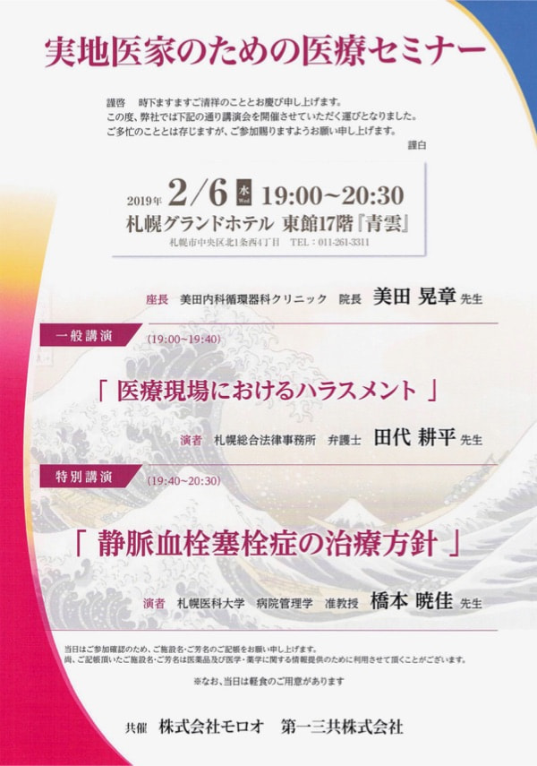 このシリーズも第5回目になるが40名を越す出席があった。第3回目から恒例の田代耕平弁護士の法律関連のセミナーも好評である。今回は「医療現場におけるハラスメント」で、わかりやすい解説であった。